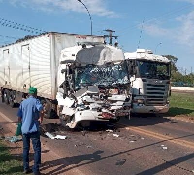 Dois caminhões sendo um tanque e outro baú se envolveram em um acidente de trânsito nesta manhã de terça-feira (4), na BR-163, de frente ao